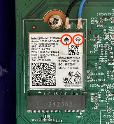 Connect the antenna cables to the AUX and MAIN ports on the module.