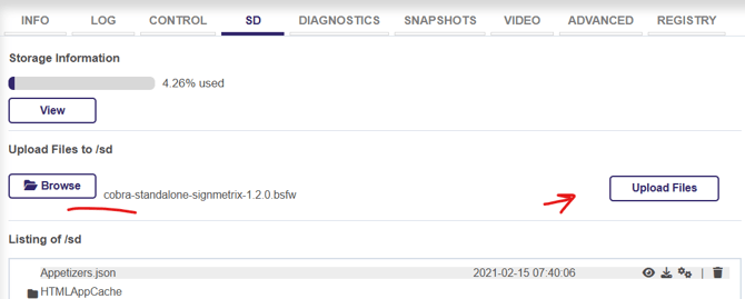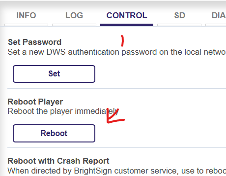 - Use the BrightSign device webpage and upload the extension using the SD tab, and then, in the Control tab, reboot the player.