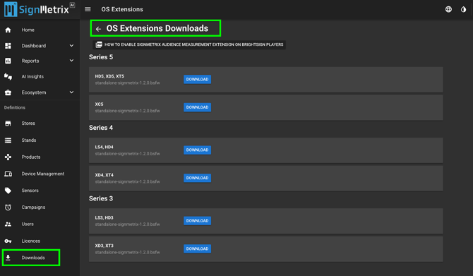 To add SignMetrix audience measurement to your BrightSign player, you need to install the SignMetrix OS extension. There are a number of SignMetrix OS extension downloads that support BrightSign players ranging from Series 3 to Series 6. Please download the version that matches your player from the SignMetrix Dashboard > Downloads > BrightSign > OS Extensions