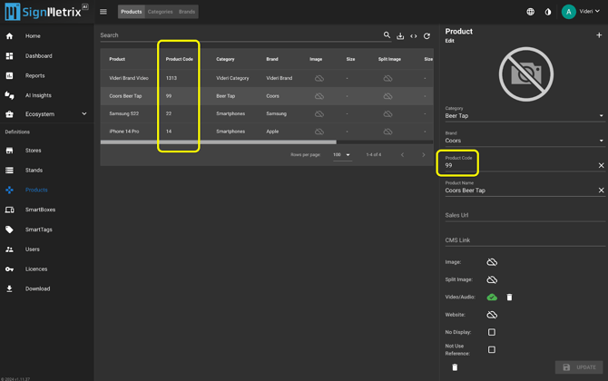 The Product Code in the"text string" is the same Product Code number that is defined in the SignMetrix Panel, as shown below in the yellow box.