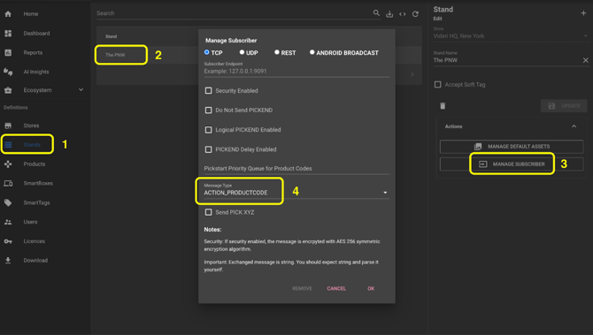As soon as a SmartTag, which is assigned to the defined stand, is picked, the PICKSTART event is sent to the defined server. When the user puts the SmartTag down, the PICKEND event is sent.