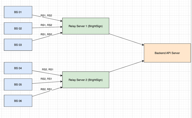 In this configuration, there are 2 BrightSign relay servers and 6 BrightSign clients. All clients can communicate with both relay servers.